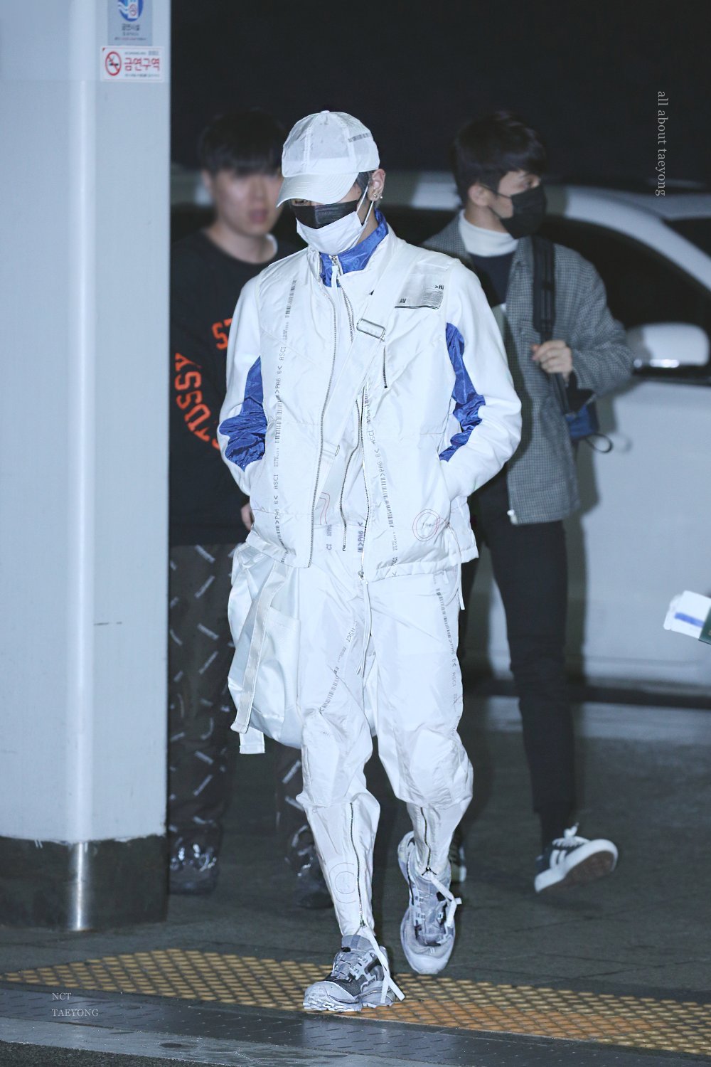 Tag BlueWhiteGreyHairCapCrossbodyBagFaceMaskSneakersAirport